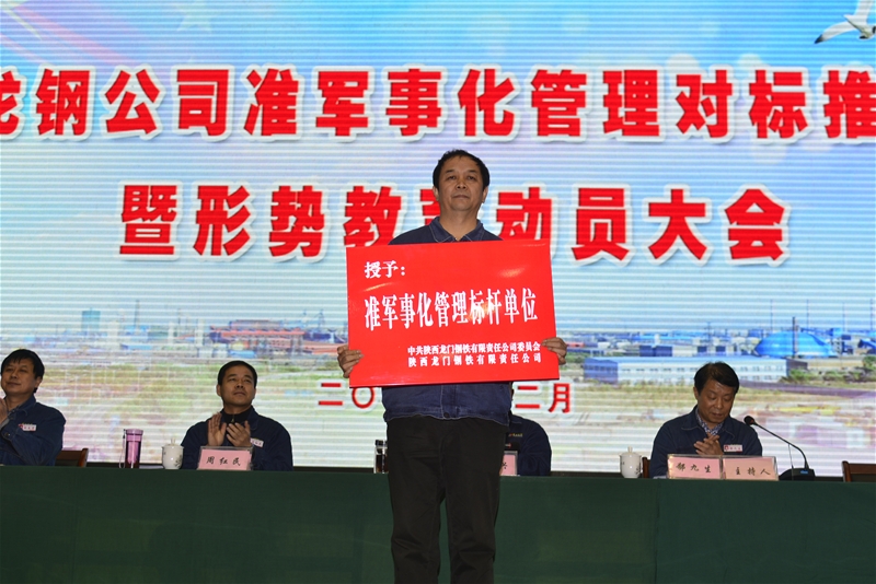 会议系统分析了准军事化管理工作的推进成效及存在问题,清晰明确了今后的努力方向,昌龙公司交流了准军事化管理的经验和心得 太阳成集团官网,公司准军事化管理主管领导,副总经理杨召朋就深层次推进准军事化管理提出了具体要求,公司工会主席赵春棠宣读了《关于授予昌龙公司准军事化管理标杆单位的决定》,公司党委副书记,董事长杜东兴向昌龙公司颁发了准军事化管理标杆单位示范牌。
